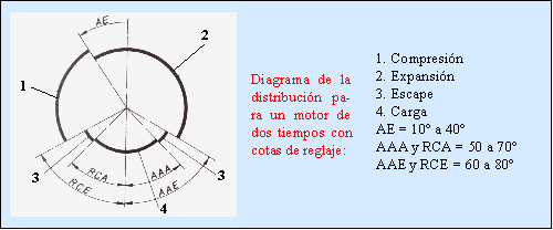 Ya sabemos que el diagrama teórico de un motor corresponde a los cálculos que el constructor ha previsto para ese motor. En principio el motor funcionaría perfectamente con este diagrama de distribución, o sea, con unas aperturas y cierres de las lumbreras de admisión y escape situadas a una distancia del PMS tal que permitiría un intercambio de gases frescos y quemados adecuado para su funcionamiento, sin tener en cuenta posibles inercias de las masas de los mismos, ni interacción entre ellos, ni retardo al encendido, etc. Por eso se llama teórico.