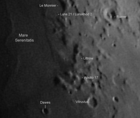 | This is one of the most easily seen of the Apollo landing sites. Apollo 17 isn't the only craft that landed in this area. Lunokhod 2 was a Soviet un-manned rover that drove around the crater le Monnier. Among other space vehicles here on Earth, the Lunokhod was put up for sale by the cash desperate Russians and was sold to Richard Garriott the founder of Origin and creator of the Ultima series of role playing computer games. I hope they at least gave him a plaque or a model of the rover. |