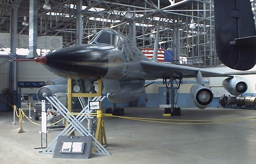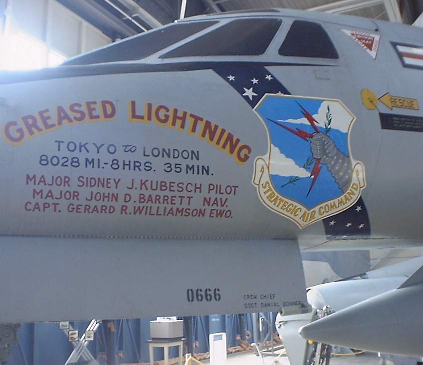 | This B-58 is painted the same as the record breaking "Greased Lightning" This aircraft is an earlier test plane used by Convair. The real Greased Lightning is at the SAC Museum in Nebraska and has seen better days from being displayed outside. |