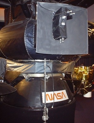 | Shielded to protect the sensitive instruments, the attitude control thrusters can rotate and maneuver the spacecraft. Also note the almost extinct NASA "worm" logo. Click for pictures of the Probe relay antenna Click here for a picture of the atmospheric probe. |