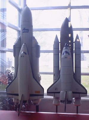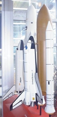 | The model on the left is the Buran spaceplane that flew only once back in 1989. It made one orbit with no crew aboard and landed on an airstrip near where it was launched. The dimentions of the then Soviet shuttle are similar to the U.S. shuttle but it is no copy. It benefitted heavily on basic design of the U.S. space shuttle but it is a complete Russian design. . |