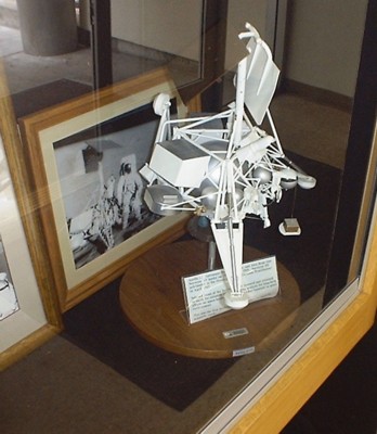| Surveyor's goal was to soft land on the moon. The Russians beat Surveyor to the moon by 4 months. The surveyors returned pictures and scraped the soil with a mechanical scoop. Note undeployed landing gear near picture of Apollo 12 astronaut. He is Charles Conrad and is standing on the moon next to Surveyor 3. |