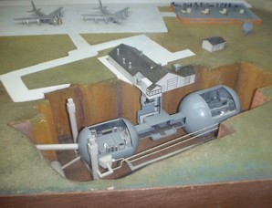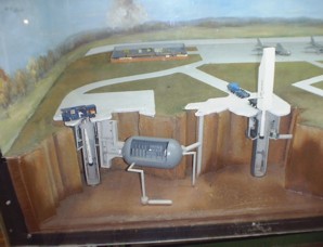 | Above is a model of what a Minuteman silo complex looked like underground. In the upper part of the picture you see a B-52 for scale. HUGE!! In the hangar, there are three different silos that simulate different parts of the real silo. The first picture below is looking up at the base of the missile. Picture 2 is the blast door and behind that was a huge round door that offered ladder access to the missile. For training purposes, a stairway was installed. And picture 3 is one of the silos that is currently being restored. You can get some scale from the seats at its base. |