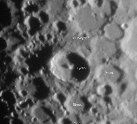 Tycho is a crater that is about 50 miles wide and has a central peak (visible here!) that is nearly a mile high. Also, the United States unmanned craft Surveyor 7 landed here in July 1968.