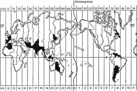 Bild 20. Die Zeitzonen und die Datumslinie. Die schwarz gezeichneten