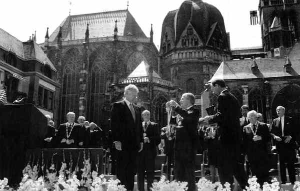 Aachen lag immer schon im Westen und war die erste deutsche Stadt, in die die Amerikaner im Herbst 1944 einzogen; hier erschien die erste freie Tagespresse. Oberbürgermeister Linden beschwor die „Wertegemeinschaft“ zwischen Europäern und Amerikanern und hoffte, dass „dieses Jahrhundert zum größten Menschheitsertolg in der Geschichte“ werden möge. Die Gäste aber mussten sich eingestehen, dass der Oberbürgermeister in seinem Elan den Erfolg der Stadt Aachen, den der Besuch Clintons bedeutete, schon mit dem der Menschheit gleichgesetzt hatte. Um zurückzufinden, sang die Festgesellschaft erst einmal „die Karlshymne“ aus dem 12. Jahrhundert: „Aachen, Kaiser-stadt, Du Hehre, Alter Städte Krön und Ehre. Königshof voll Glanz und Ruhm!“