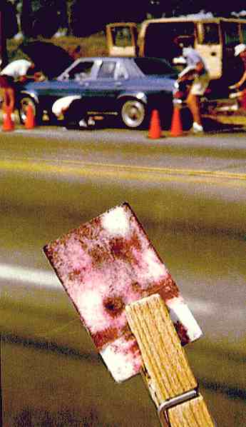 Telltale pink on treated paper (below) reveals lead in car exizaust