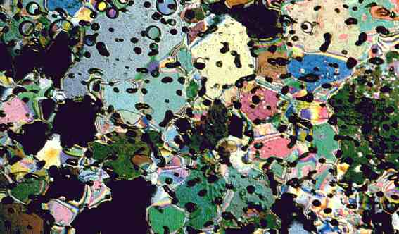 An ice sample from a glaciated plateau on Mount Logan (above) seems to bubble like club soda. Individual ice crystals take on different colors according to the angle at which polarized light strikes them.