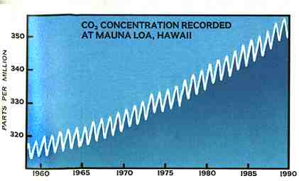 Here for 32 years the level of carbon dioxide in the earth's atmosphere has been recorded daily at the Mauna Loa Observatory by Charles David Keeling of the Scripps Institution of Oceanography and by scientists from the National Oceanic and Atmospheric Administration (NOAA). And for 32 years the level has risen, in a wavy curve of spring-fall variations (opposite), from 315 parts per million (ppm) in 1958 to more than 355 in mid-1990.