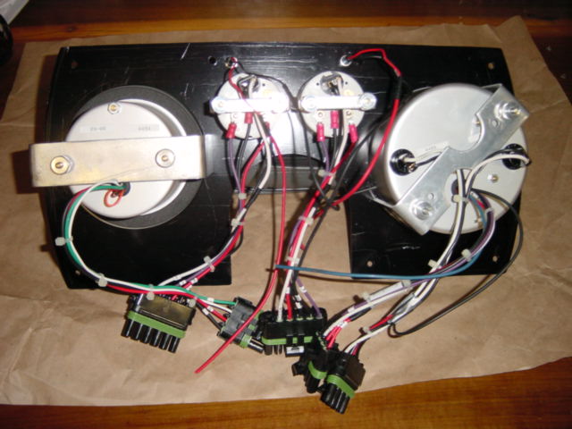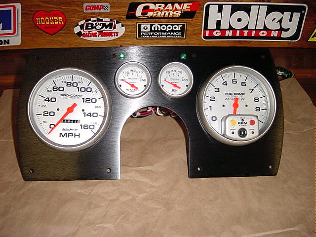 | I removed the stock gauge cluster and replaced it with my own. An aluminum panel was fabricated to hold the four main gauges in the dash. The panel was brushed and anodized gloss black after it was machined. The two additional gauges are mounted using a gauge pod. Autometer Ultra-lite electric gauges were used along with an Autometer Quick lite shift light. The Speedometer is electronic so it can be calibrated for gear changes and/or tire size changes. I added weather pack connectors to each gauge for easy removal and installation. The bright lights indicator was moved to the panel just below the headlight switch. I also converted to an electric cooling fan and installed a manual fan switch and indicator light. The manual fan switch and indicator light is located under the lighter. |