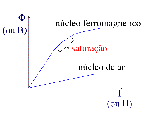 Introduzindo um núcleo de material ferromagnético no interior da bobine, o fluxo magnético toma valores muito maiores que com núcleo de ar, para os mesmos valores da corrente I. Este grande aumento do fluxo em relação à bobine com núcleo de ar deve-se à contribuição dada pelos átomos que são, na realidade, pequenos ímanes (ver Permeabilidade magnética). Estes átomos, inicialmente desordenados, rodam e alinham-se segundo as linhas de força do campo magnético produzido pela corrente. Ao alinhar-se, o fluxo que possuem soma-se ao fluxo inicial. Quanto maior for o valor da corrente, maior é o número de átomos que se alinham e maior o valor do fluxo total. À medida que a corrente aumenta, o número de átomos que resta por alinhar é cada vez menor e, por isso, o fluxo não aumenta proporcionalmente à corrente. Após o aumento inicial linear do fluxo, entrou-se numa zona de saturação. Quando todos os átomos estiverem alinhados, o aumento do fluxo com a corrente volta a ser linear (mas pequeno, tão pequeno quanto era com a bobine com núcleo de ar), dependendo apenas do valor da corrente. A linha do gráfico é, então, paralela à linha correspondente à bobine com núcleo de ar. |