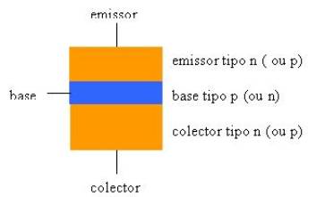 pastilha quadrada com cerca de 1 mm de lado e uma espessura muito menor. O transístor tem dimensões minúsculas e a sua constituição só pode ser vista no microscópio. Na figura vê-se o transístor de cima, muito ampliado. Distinguem-se 3 zonas claras, que correspondem às 3 camadas que constituem o transístor. Estas 3 camadas estão sobrepostas. Se cortássemos o transístor “de alto a baixo”, encontraríamos uma estrutura do tipo da figura seguinte. |