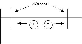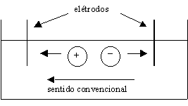 Num eletrólito, como a solução aquosa de ácido sulfúrico no interior de uma bateria de chumbo, a corrente elétrica é assegurada pelo movimento de iões com carga positiva e com carga negativa. Os iões positivos dirigem-se num sentido e os negativos no sentido oposto.