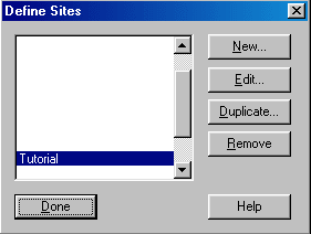 Before you begin, you must first define the site. You do this in the Pop-up window in the toolbar (in the screen shot it says 'tutorial'). Select define sites, which will bring up the following dialog box: