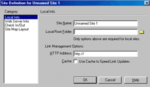 You can also specify your FTP server, Web Server, configure your site map, and specify whether you would like to Check Files In and Out. The latter is usually only relevant when other people (a team) are working within the same site.