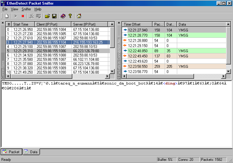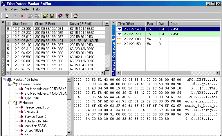 -The Difficult thing is you need to get the Server Port like you see it is the 3rd by me. Once you Clicked on the Server Port The Packages will be Shown on the Right Site. The Blue Arrow are Outgoing Packages that i Send. The Orange/Yellow arrows are what i Recieved. I Clicked on the First Packet and you can See the Packet. This Packet appeared after I buzzed the Yahoo Id sonic_da_boot_bot9.If you click down on Data you will see the Data like this