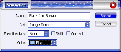 Now in the popup Name Your Set and press OK. I named by set Image Borders. Now lets create a new action by pressing the Create New Action button (see screenshot below) and select which set you want this new action to belong to. The other options can be left at their default state. Once you have set all your options press Record (the equivalent of OK in any other popup).