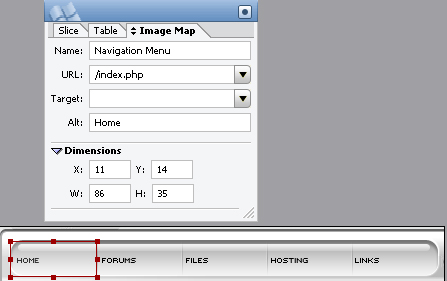 Click and drag to outline the area you wish to make a click able link. When you have finished outlining the image map shape, in the URL box, enter the path to the HTML page you want to link to. ImageReady automatically names the slice, which you can rename to something more descriptive, as shown below.