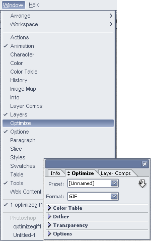 Now open the Optimize Dialog Box by going to Window > Optimize.