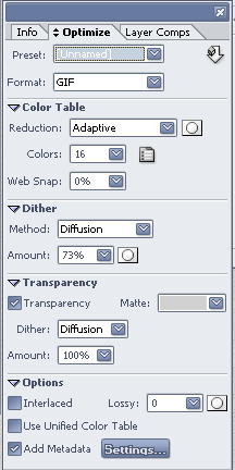 Within the Transparency section, check the Transparency checkbox to ensure that any transparent areas within your document in ImageReady appear similarly in the final Web-ready graphic. Click on the Matte drop-down menu within the same Transparency section to determine which color your artwork should blend towards before becoming fully transparent.