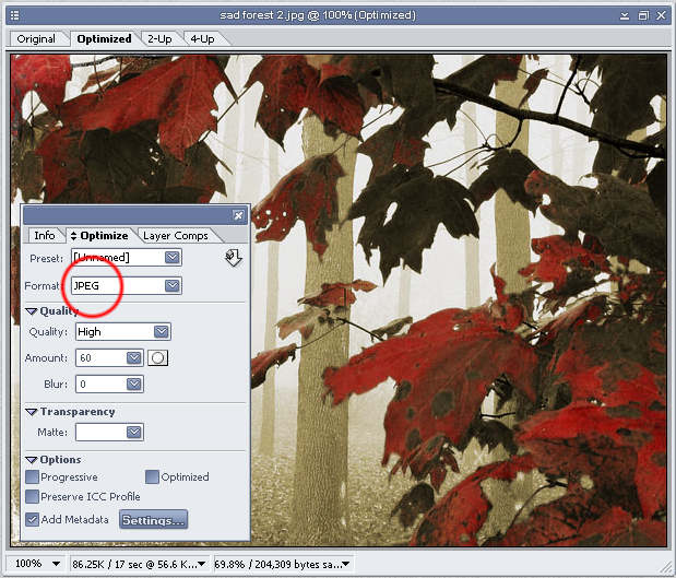 Welcome to part two of the optimization tutorial series. In this part we will cover how to optimize a JPEG graphic. For the purposes of this tutorial we will be working with ImageReady. Before we jump into this tutorial, lets discuss what a JPEG is exactly. First, a little bit of useless information you will never need, JPEG owes its name to the Joint Picture Experts Group, a gathering of ISO members. This group developed a file format known as lossy. A lossy image format will discard pixels from the original image based upon the level of quality used when saving. The JPEG format is able to reduce an image’s file size by approximating the transitions between pixels that surround the discarded pixels. Not only can JPEGs produce very small image sizes, they can contain millions of colors, unlike the GIF format’s maximum of 256 colors. Because of this color depth, JPEG is the ideal format for encoding photographs for the Internet.