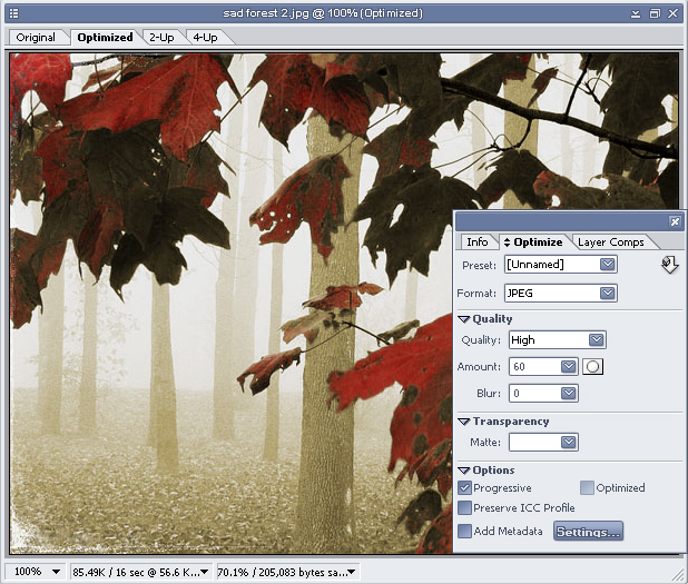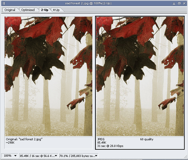Choose File > Save Optimized As to save the Web-ready version of the document you just modified. Here is our final version: the size went down from 290K to 85.49K, and the image still looks colorful and sharp.
