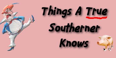 ![]() Pretty much how many fish make up a mess. What general direction cattywumpus is. That "gimme sugar" don't mean pass the sugar. When somebody's "fixin" to do something, it won't be long. How good a cold grape Nehi and cheese crackers are at a country store. Ain't nobody's biscuits like Grandma's biscuits !! A good dog is worth its weight in gold. Real gravy don't come from the store. When "by and by" is. The difference between "pert' near" and "a right far piece". At one point learned what happens when you swallow tobacco juice. You should never loan your tools, pick-up, or gun to nobody. A belt serves a greater purpose than holding Daddy's pants up. Rocking chairs and swings are guaranteed stress relievers. Rocking chairs and swings with an old person in them are history lessons. Author Unknown!
