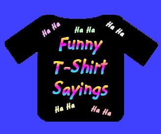 ![]() 1. "Frankly, Scallop, I Don't Give a Clam." (seen on Cape Cod) 2. "That's It! I'm Calling Grandma!" (seen on an 8 year old) 3. "Wrinkled Was Not One of the Things I Wanted to Be When I Grew Up" 4. "Procrastinate Now." 5. "My Wild Oats has turned to Shredded Wheat." 6. "My Dog Can Lick Anyone." 7. "I Have a Degree in Liberal Arts - Do You Want Fries With That?" 8. "Party - My Crib - Two A.M." (on a baby-size shirt) 9. "They call it 'PMS' because 'Mad Cow Disease' was already taken." 10. "Time's fun when you're having flies.......Kermit the Frog." 11. "POLICE STATION TOILET STOLEN .... Cops have nothing to go on."