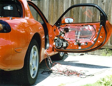 Radio and box removed. The RX7 has two standard DIN size holes but the depth are limited. I had a hard time putting the radio in since the wires took up all the space in the back. Putting just a CD or tape deck would be easy but when EQ and AMP wires are added, back space are very limited. I found that more depth are possible when the wires are push behind the steel thing in the back. My setup barely worked and this was after taking it in and out few times to adjust the position of the wires.
