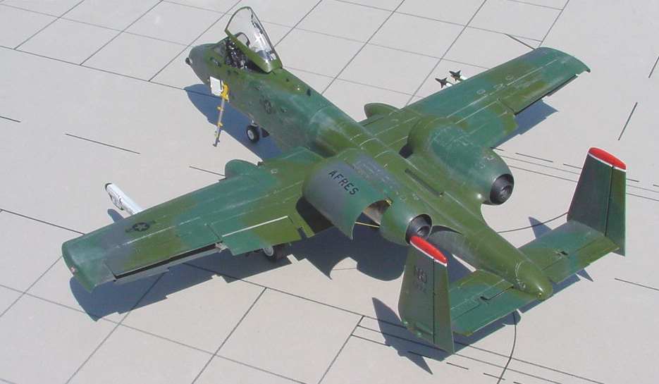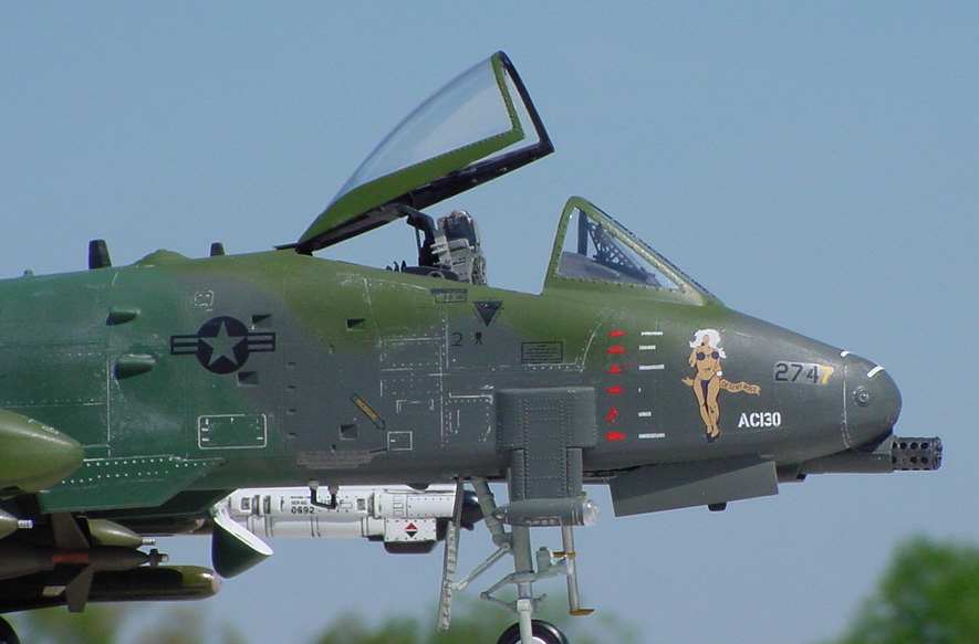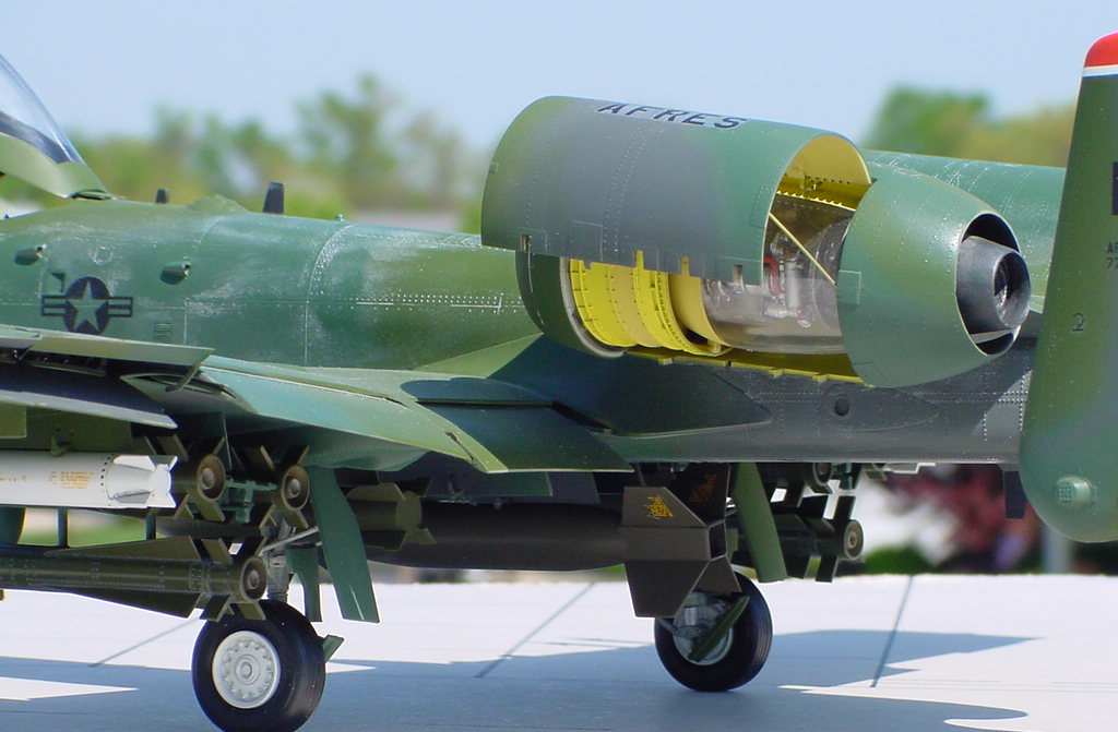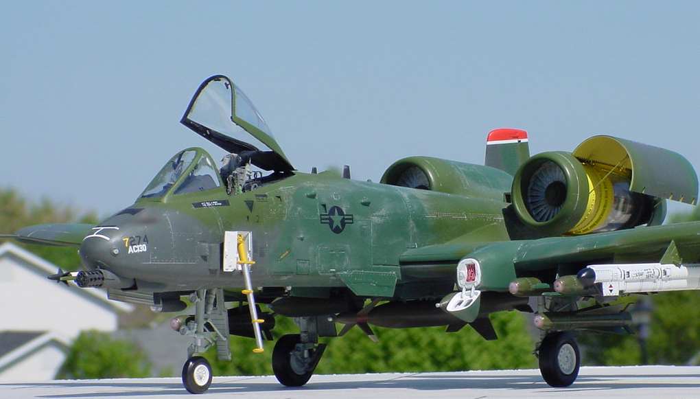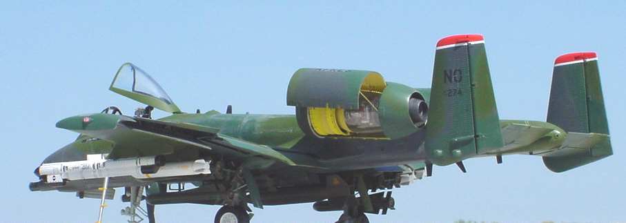 | Trumpeter A-10 'Warthog' This is the 'big' Hog from Trumpeter. When first announced in 2000 it was a highly anticipated kit. After building it I all I can say is Trumpeter has a way to go. The fit was OK. Cockpit detail was sadly lacking, however. I had planned on using the BB resin cockpit but trying to get it to fit was an exercise in futility. I opted for the CE resin pit and it fit like a glove. I will say this; you get plenty of weapons to choose from for the load out. The detailed resin engines included are also nice. There's been much talk about the scale inaccuracies but I'm not all that concerened about them. The finished kit looks plenty like a real 'Hog' so I am not troubled. I used decals from Eagle Strike Productions depicting a LA ANG bird used in the 1991 Gulf war. To read the full article click here |