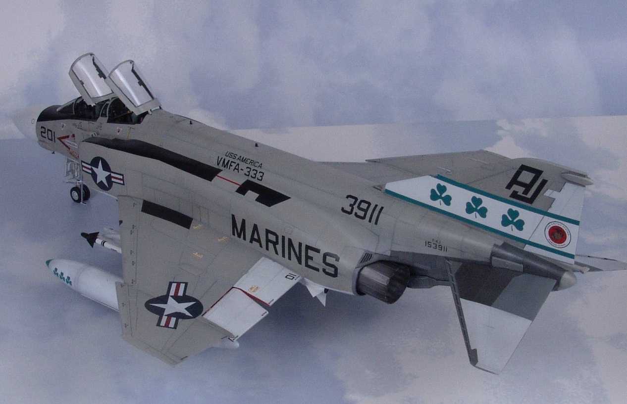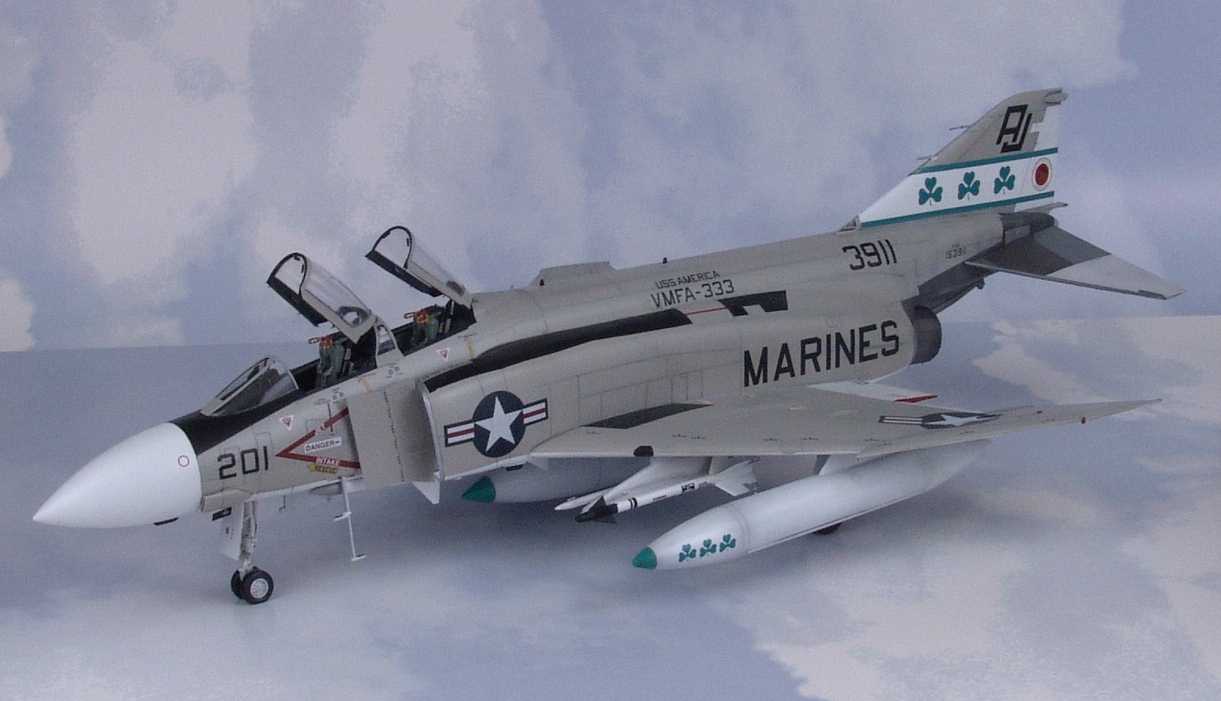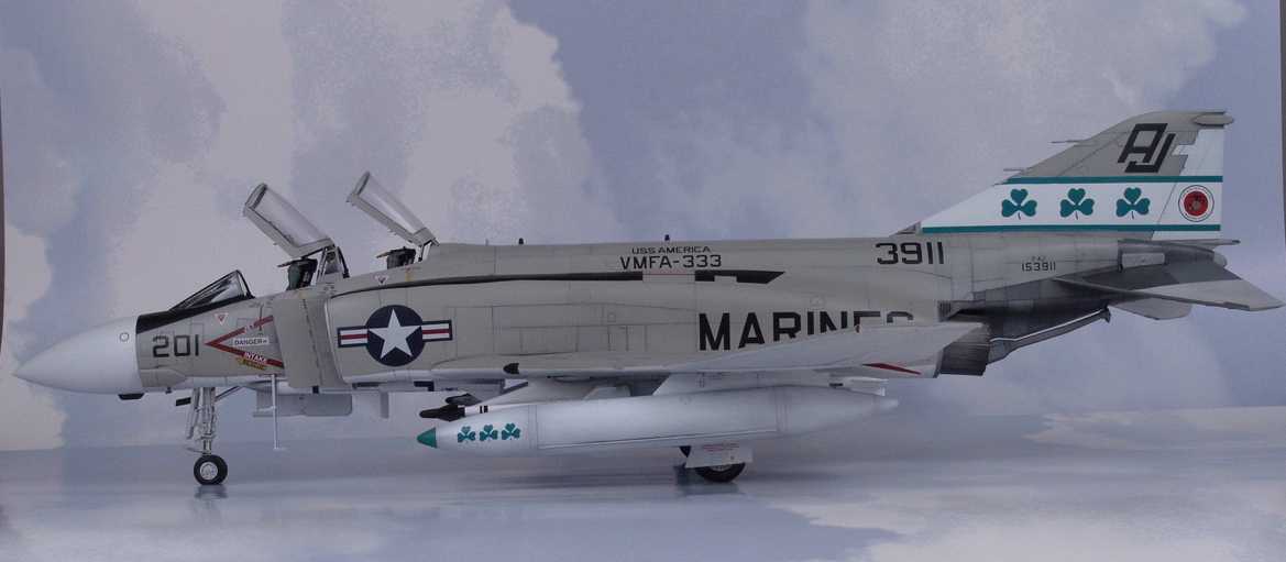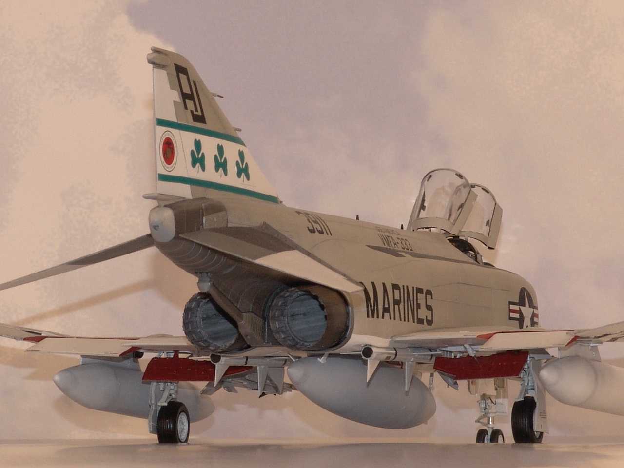 | 1/32 Tamiya F-4J Phantom This is Tamiya's 1/32 F-4J in Marine squadron VMFA-333 colors. I've added the Eduard PE detail set, True Details MB Mk 7 seats, CE seamless intakes, resin nozzles, wheels and CAM decals. The kit goes together rather well. Some putty and filler are required for the intakes but that is much preferred to the kit furnished ones. Other than that not much putty is needed. I had to correct the kit furnished AIM-9's to put the forward fins in their proper locations. As with all big Tamiya kits the level of detail is fantastic. Prior to painting the panel lines were pre-shaded with grimy black. The model is painted with a mix of tamiya and PollyScale acrylics with MM metalizers and ALclad II for the exhaust areas. An enamel wash was applied to bring out the panel lines and gear well areas. The model was finished off with an overall semi-gloss of PolyScale clear acrylic. |