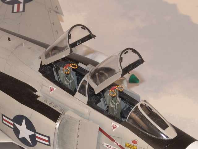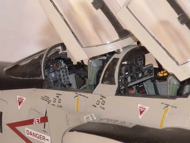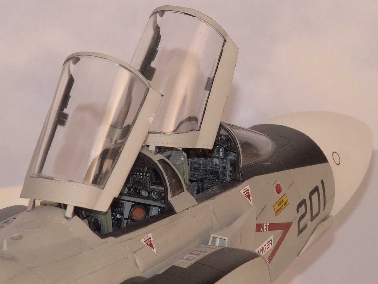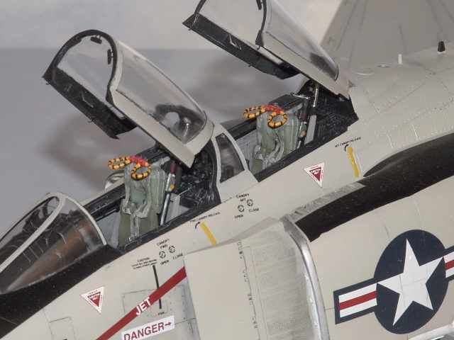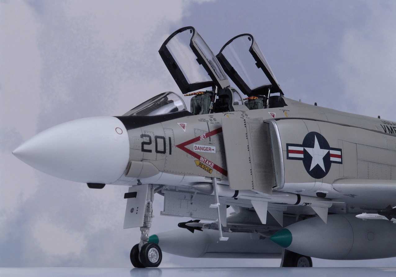 | 1/32 Tamiya F-4J Phantom This is Tamiya's 1/32 F-4J in Marine squadron VMFA-333 colors. I've added the Eduard PE detail set, True Details MB Mk 7 seats, CE seamless intakes, resin nozzles, wheels and CAM decals. The kit goes together rather well. Some putty and filler are required for the intakes but that is much preferred to the kit furnished ones. Other than that not much putty is needed. I had to correct the kit furnished AIM-9's to put the forward fins in their proper locations. As with all big Tamiya kits the level of detail is fantastic. Prior to painting the panel lines were pre-shaded with grimy black. The model is painted with a mix of tamiya and PollyScale acrylics with MM metalizers and ALclad II for the exhaust areas. An enamel wash was applied to bring out the panel lines and gear well areas. The model was finished off with an overall semi-gloss of PolyScale clear acrylic. |