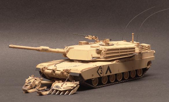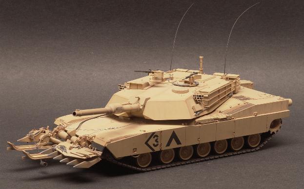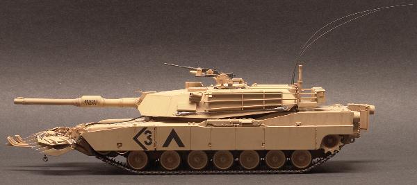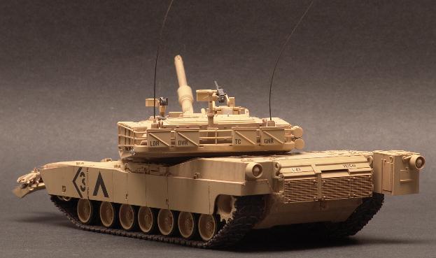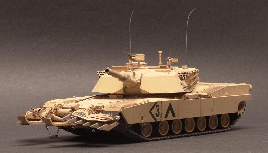 | 1/35 Tamiya M1A1 Abrams Tank The M1A is the main battle tank of the US Army. It is easily the most powerfull tank in the world today. Its main weapon is a 120mm smooth bore cannon. It can travel at speeds in excess of 50mph over most any terrain and still fire its gun and hit the target. The M1A first saw action in Desert Storm in 1991. This particular model represents a tank from the 3rd Armor Division as during the Gulf War. Although 3rd Armor was deactivated after the Gulf War it has not been officially de-commisioned.The Tamiya kit is a very nice build. I chose the build the version with the mine plow because it looks so much more interesting than a plain M1A tank. I would like to display it with crew members in the hatched but my skills at figure painting are sorely lacking. So, for now, it remains "buttoned up". The model is painted with MM Enamels and given a burnt sienna wash to highlight. |