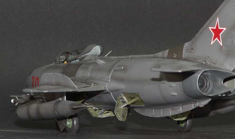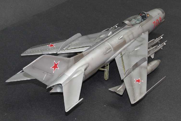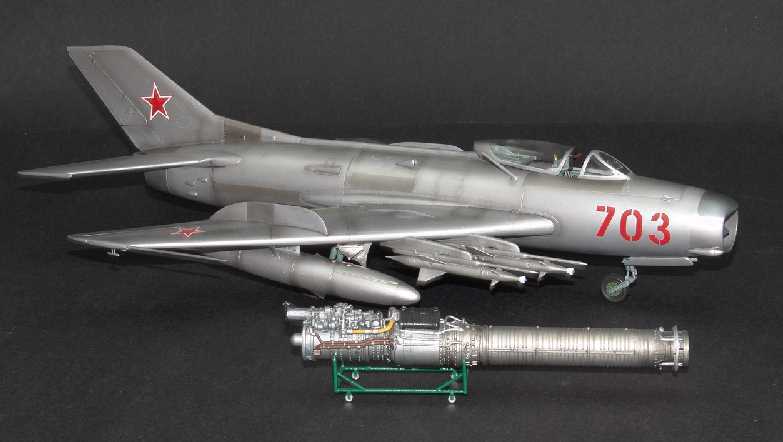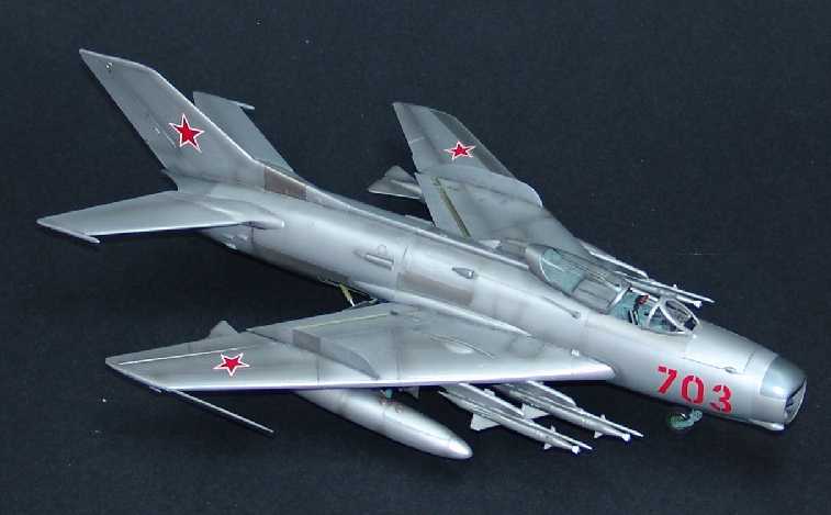 | Trumpeter 1/32 MiG-19PM 'Farmer E' Trumpeter's Mig-19 is a very nice, large scale model of an often overlooked Soviet cold war era fighter. There is plenty of detail, inlcuding 2 Turmansky RD-9 turbojet engines. I added an Eduard PE set for the cockpit and this really enhances what Trumpeter already provides. This is my first NMF aircraft model. I used a base coat of Floquil old silver followed by panel highlighting with Alclad II. Post shading of panel lines was accomplished with Alcladd II duraluminum. |