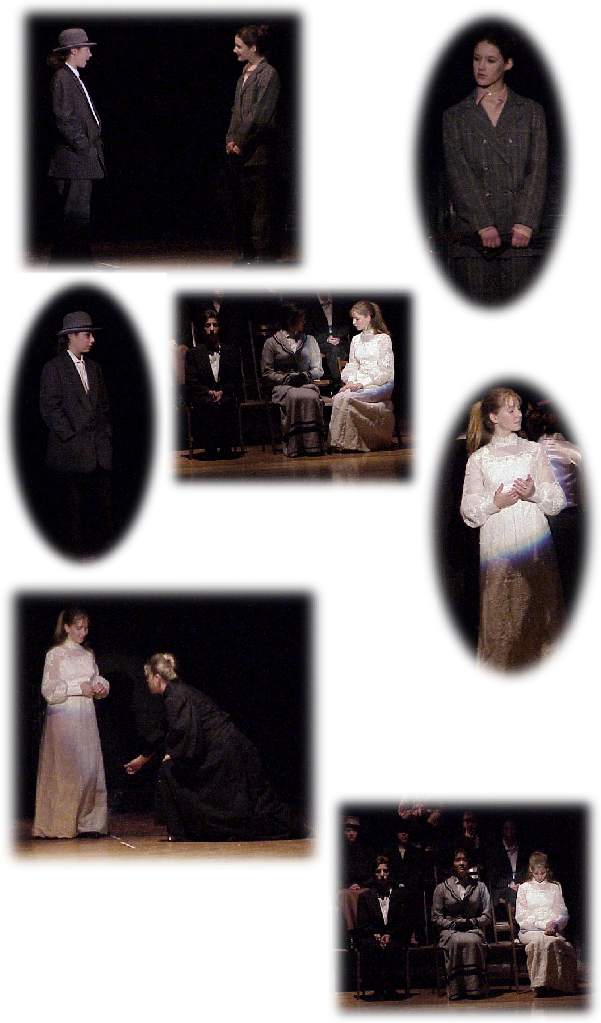 | In the third act we are led to the cemetery on the hill, where many of the townspeople we have come to know so well are patiently and smilingly awaiting not "judgment" but greater understanding. Into their midst is led the bride, a little timid at first, a little wishful to go back to life, to live again with her memories. But she is shown how impossible, how futile it is to return. The past cannot be re-lived. Living people, humans, occupied with their petty occupations and small thoughts, know little of true joy or happiness. Truth is to be found only in the future. |