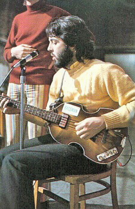 | Paul with the 1963 Hofner during the "Let It Be" filming in January 1969. Note the BASSMAN sticker, which came from the box Johns Fender 'Bassman' amp was sent in. Copyright Apple Corps. | ||||||||||||||||||||||||||||||||||||||||||||||||||||||||||||||||||||||||||||||||||||||||||||||||||||