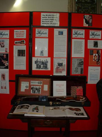 | Johns current Hofner, on display with the story of the gold plated Hofner around it for a feature John did on the Sixties for the Leighton Buzzard.In front of the bass you can see the book Beatles Gear, turned to the page with the gold Hofner. (c) John Bunning | ||||||||||||||||||||||||||||||||||||||||||||||||||||||||||||||||||||||||||||