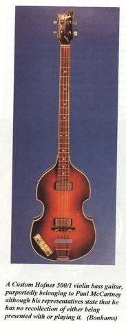 | The History Behind the 500/1: The bass as once owned by John Bunning has a odd history of its own before it wound up in his hands. It seems Hofner/Selmer knew it had a hot ticket on its hands in 1964, with every bass player on Earth wanting one of their violin basses. And Paul McCartneys use of that bass was the main reason. Beatles manager Brian Epstein didn't usually consent to the boys shilling for or promoting any product personally. However, an exception was made, sort of, in this case. Epstein made a deal with Selmer for Paul to be seen 'endorsing' the basses by way of a 'swing-tag' on each new guitar that showed Paul giving the famous Macca thumbs-up, along with the quote "Wishing you every success with this guitar!". In return, Epstein got a piece of the action (around 5 pounds a bass) |