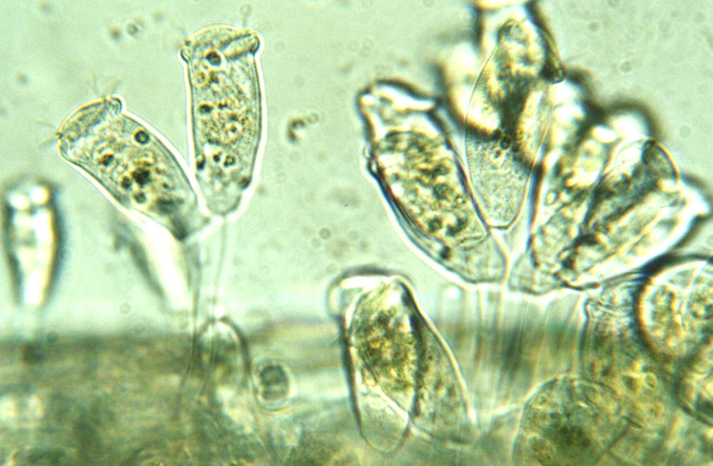Grandes colonias flotantes de Epistylis, asociadas a Vorticella,