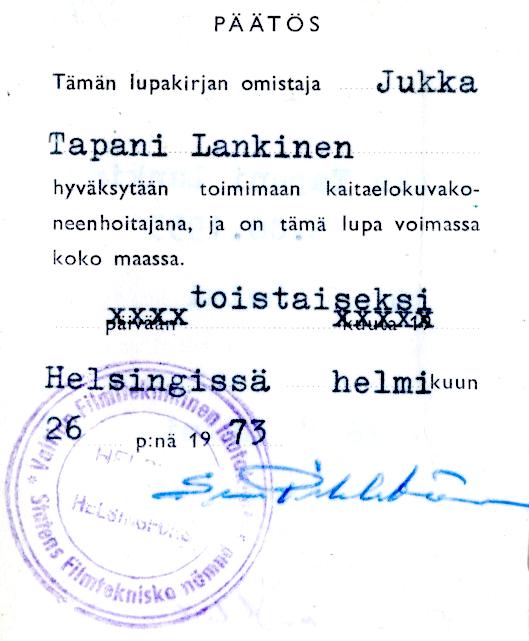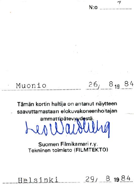 Suomen Filmikamarin antama 35 mm elokuvakoneenhoitajan