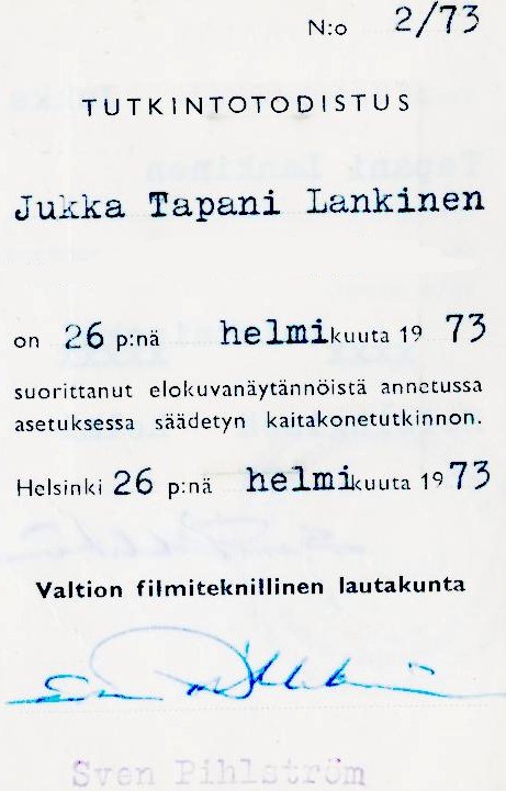 Kaitaelokuvakoneenhoitajan tutkintotodistus