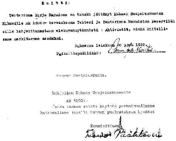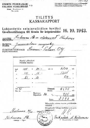 "... Suojeluskunnan elokuvat pyytää kunnioittaen huomauttaa seuraavaa: Koska sk:n teatterissa on esitetty mm. suomalaisia elokuvia joiden lippujen hinta on ollut lapsilta mk 5,- ja valtion huvivero nimellisesti 10 %. Mutta todellisuudessa on k.o. lippujen vero 12 %. Sillä mainitut liput 100 kpl vihkoissa maksavat mk 60:-. Edellisestä johtuu, että mainittujen elokuvien kohdalta "Bruttotulo" ja valtiolle maksettava huvivero on laskettava 12 % eikä suinkaan 10 % mukaan. Vielä pyydämme huomauttaa, että Teostolle tulevasta osuudesta on aina pyöristetty summaksi se penniä 5 mikä kulloinkin on ollut lähinnä täyttä viisipennistä (5 penniä)..."(Taidatkos sen selkiämmin sanoa!)