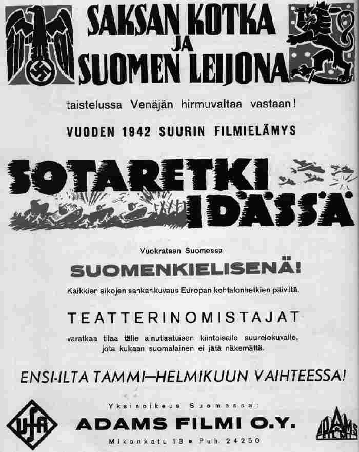Saksalaisille myönteistä ilmapiiriä lietsoivat taidokkaasti tehdyt sotadokumentit, kuten "Idän sotaretki", joka sai ensi-iltansa huhtikuun lopussa 1942 ja nähtiin Kuhmossa 16. ja 18. lokakuuta samana vuonna. Suomen Sosialidemokraatissa hehkutti nimimerkki P.L. 25.4.1942: