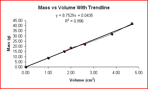 Mass Volume Density (g) (cm3) (g/cm3) 0.00 0.00 0.00 8.60 1.00 8.60 15.20 1.70 8.94 18.60 2.00 9.30 22.10 2.60 8.50 31.90 3.80 8.39 42.20 4.70 8.98