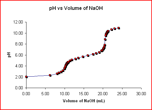 On the graph, the red vertical line at 5.12 mL is the first half-titration point which represents when one-half of the H+(aq) ions in the first ionization have been titrated with NaOH. The first half-titration point volume is one-half the volume of the first equivalence point. At the point, 5.12 mL, [H2A] = [HA-] which can be substituted in Equation (1) above to yield:
