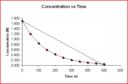 Ave RateA = -Δ[A]/Δt = -(0.053 M - 1.7 M)/(500 s - 0 s) = 0.0033 M/s