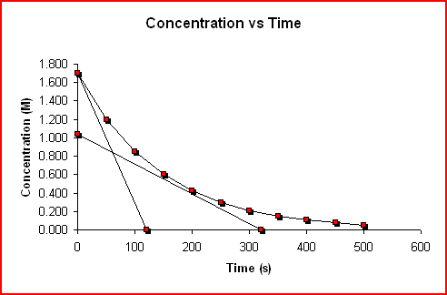 Sometimes we are interested in the reaction rate at a particular instant of time, called the instantaneous rate. The instantaneous rate is determined by calculating the slope of the tangent at a particular time as shown below.