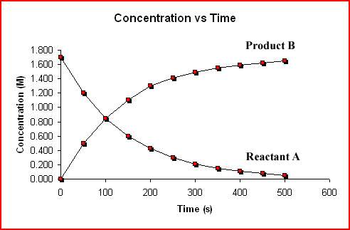 B(g), shown below. Because the coefficients of the reaction are both 1, the numerical values of these rates are equal. When comparing the two graphs below, it is evident that the rate of disappearance is highest when the concentration of reactant(s) is the highest and the rate of appearance is highest when the concentration of the products(s) is the lowest.