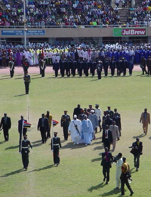 | President Jammeh of the Gambia is in white, the visiting President of Senegal is in Blue. |
