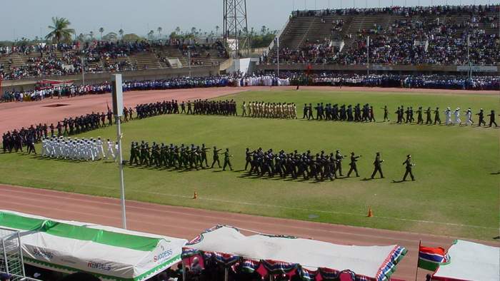 | Kate called up and got us VIP tickets from the President's protocol office, so we had excellent seats for the national celebration. It was held at the national stadium, just down the road from us. Luckily we were sitting in the shade, unlike most of the participants, so we stayed relatively cool during the 5 hours it lasted. After the arrival of the dignitaries, ending with the entrance of the President of the Gambia and the President of Senegal, there was a military review, a review of school children and volunteers, and a speech by the President of the Gambia. Below are some pictures from all of these, as well as a flavor of what the crowds looked like. The biggest hit was the fly-by of the Gambia's one military jet - the kids thought this was marvelous. We were unaware that the Gambia had a pilot in the air force to fly their plane... The military knows how to march, and sure coped with the heat. They went round three times at least, to the tune of several bands. Here the military includes the army, the police, the prison service (some of our neighbors), and the immigration service. They even had a corps of marching women police officers. Read what the official press had to say about the day |